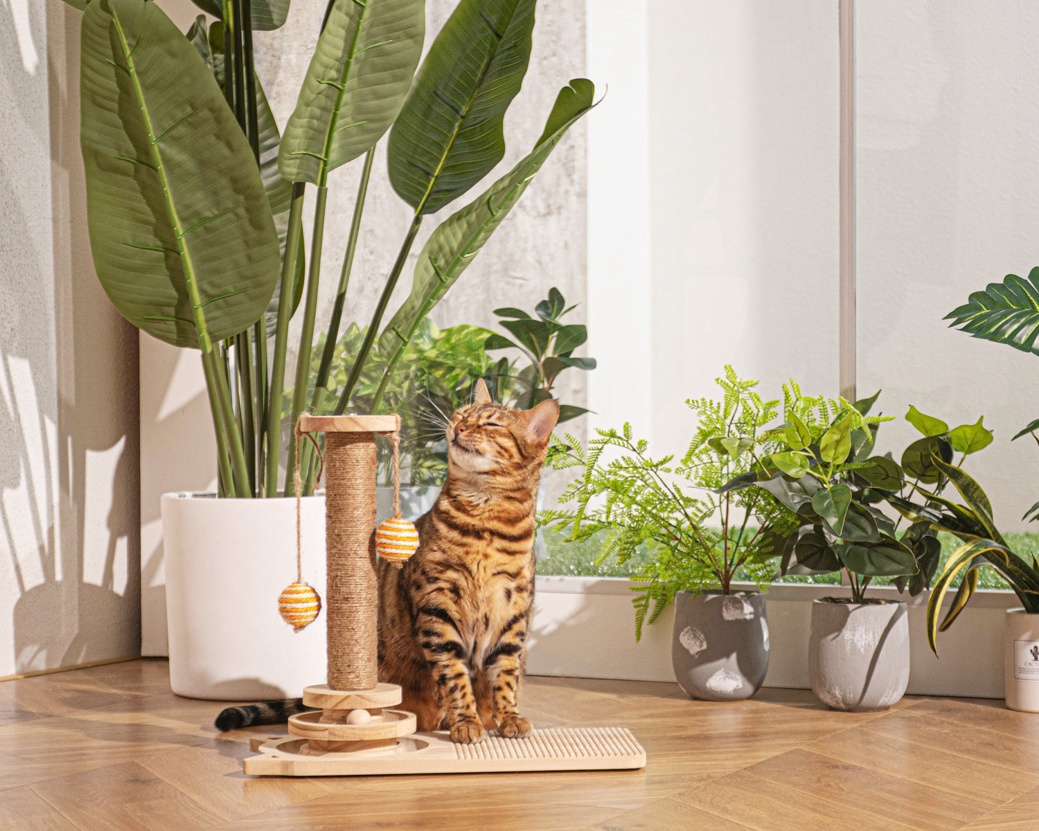 Made of solid pine wood pillar covered high quality natural sisal and polyester. No glue, non-toxic, safe and stable for your cat's play.